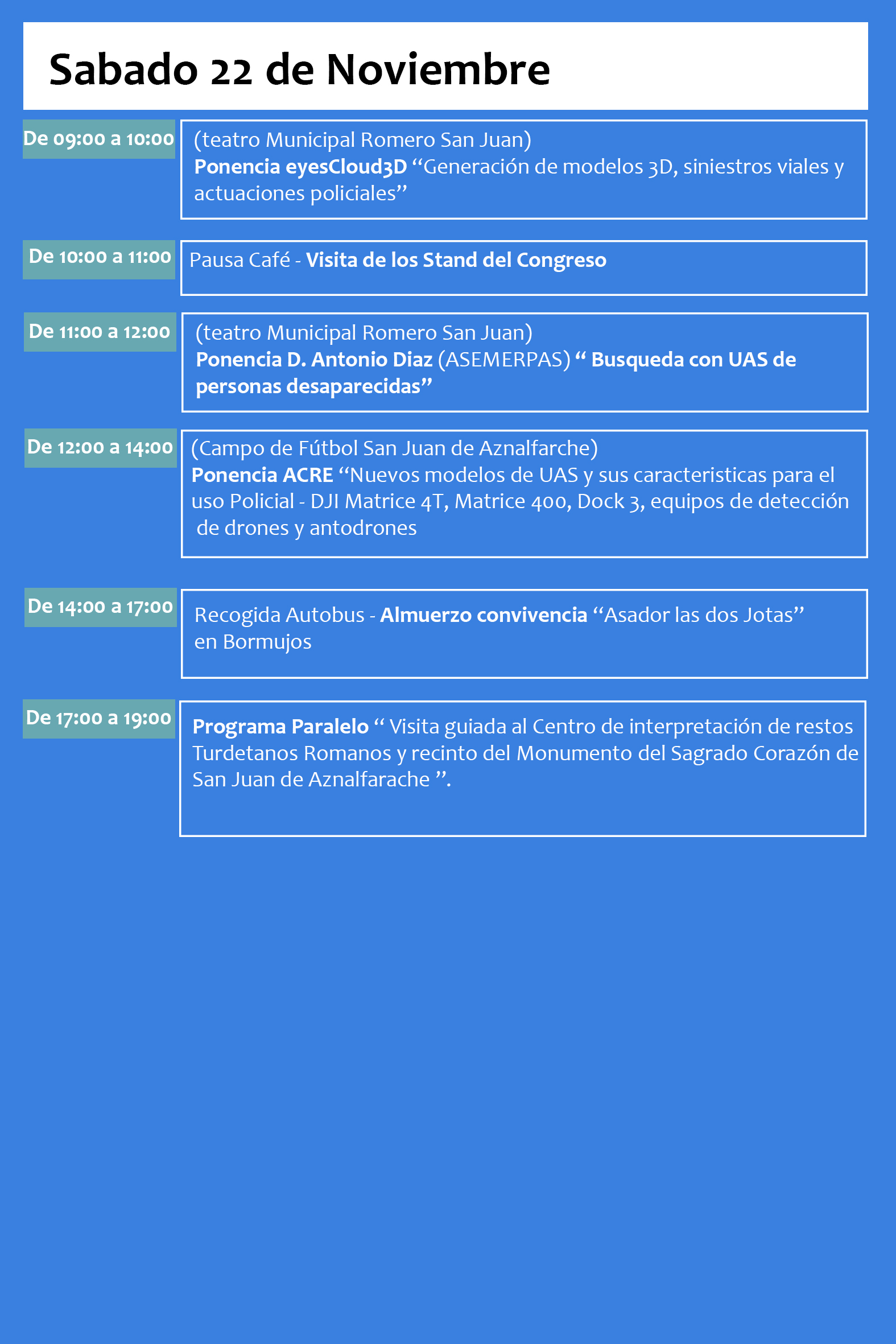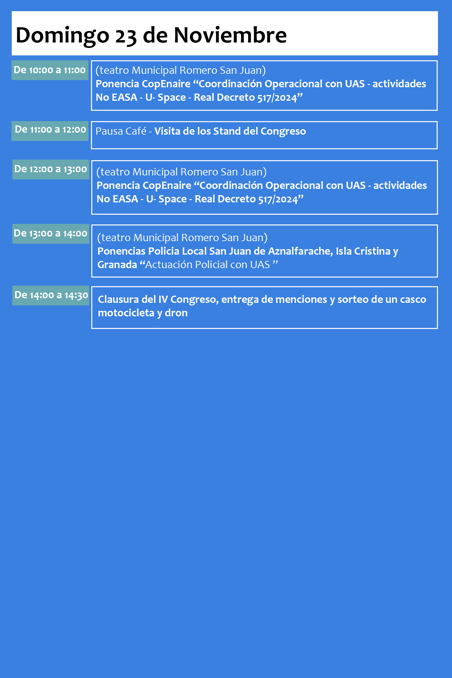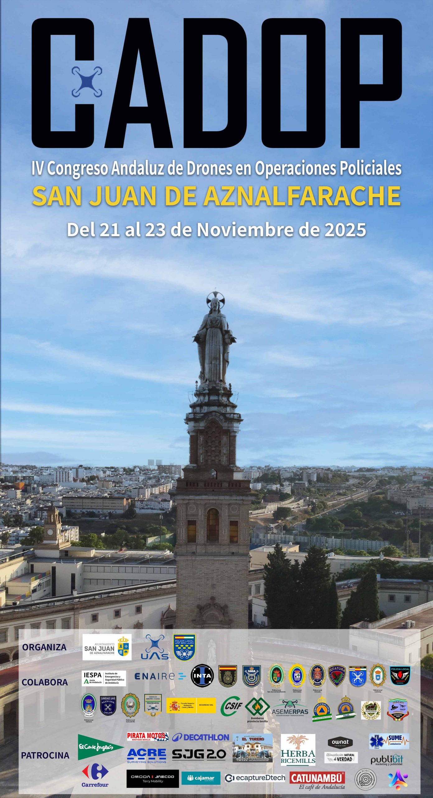 San Juan de Aznalfarache ha sido la elegida este año, para ser la Sede Oficial del IV Congreso Andaluz de Drones en Operaciones Policiales (CADOP 2025) El Ayuntamiento de San Juan de Aznalfarache, La Asociación UAS Andalucía y la Unidad UAP perteneciente a la Policía Local de San Juan de Aznalfarache, se encargarán de organizar el evento que se celebrará en los días 21, 22 y 23 de Noviembre de 2025.